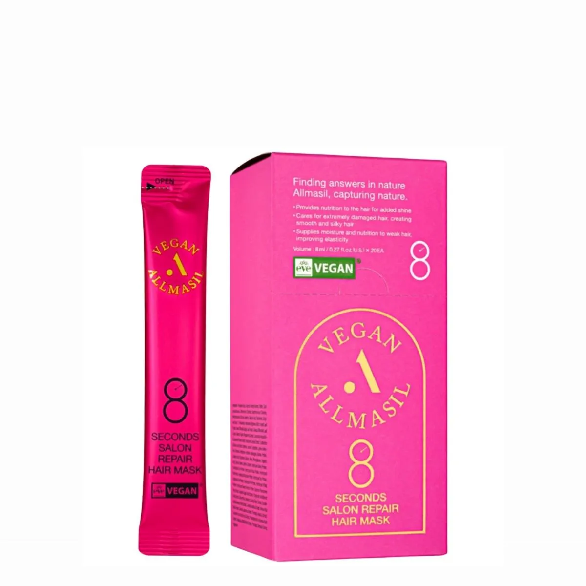 Características y beneficios destacados: All Masil 8 Seconds Repair Hair Mask Stick Pouch 20x8ml