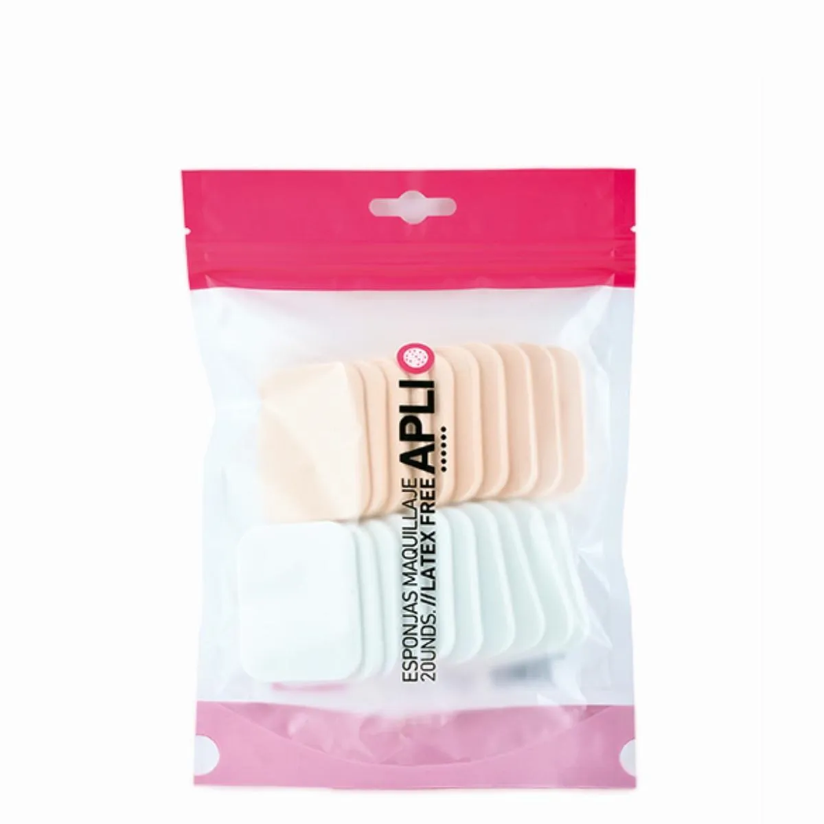 - 20 esponjas de formato rectangular, aptas para diversos productos de maquillaje.