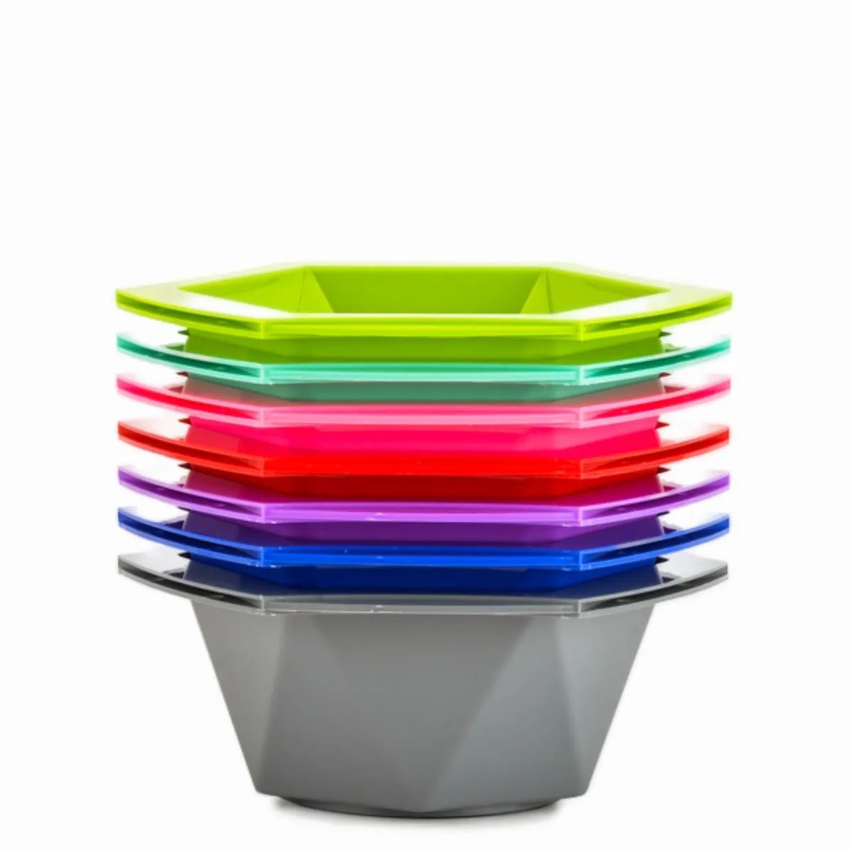 Cada bol del set está moldeado para ofrecer estabilidad y facilidad de uso. La forma hexagonal permite apilar y ordenar sin que los recipientes rueden, y su base antideslizante reduce el riesgo de derrames en el área de trabajo. El tamaño de los 7 boles cubre desde pequeñas pruebas de mechas hasta mezclas completas para cabelleras largas, ofreciendo versatilidad sin complicaciones.