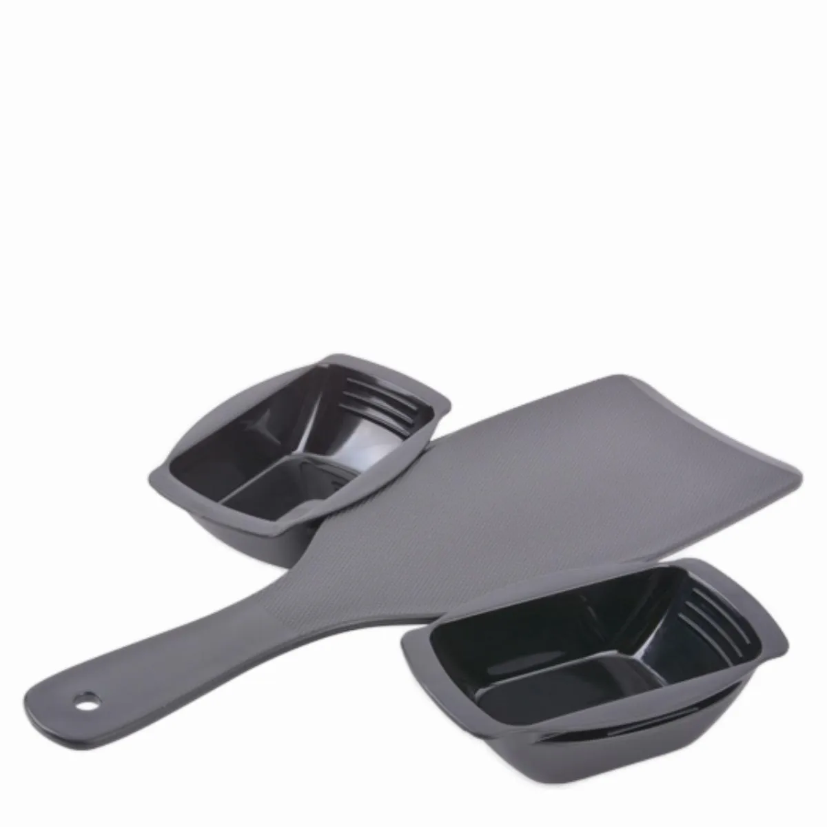 Herramientas profesionales para mechas: paleta ergonómica y dos bowls resistentes. Ideal para mezclar tintes y aplicar con precisión en salón o en casa.