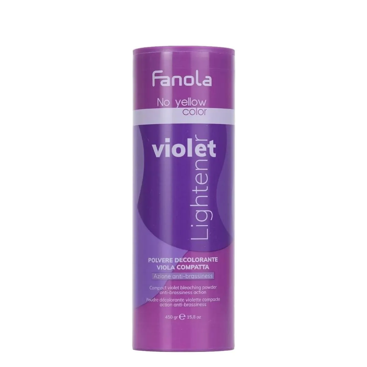 - Fanola No Yellow Polvo Decolorante Sin Amoniaco Violeta 450g — presentación generosa de 450 g pensada para uso profesional.