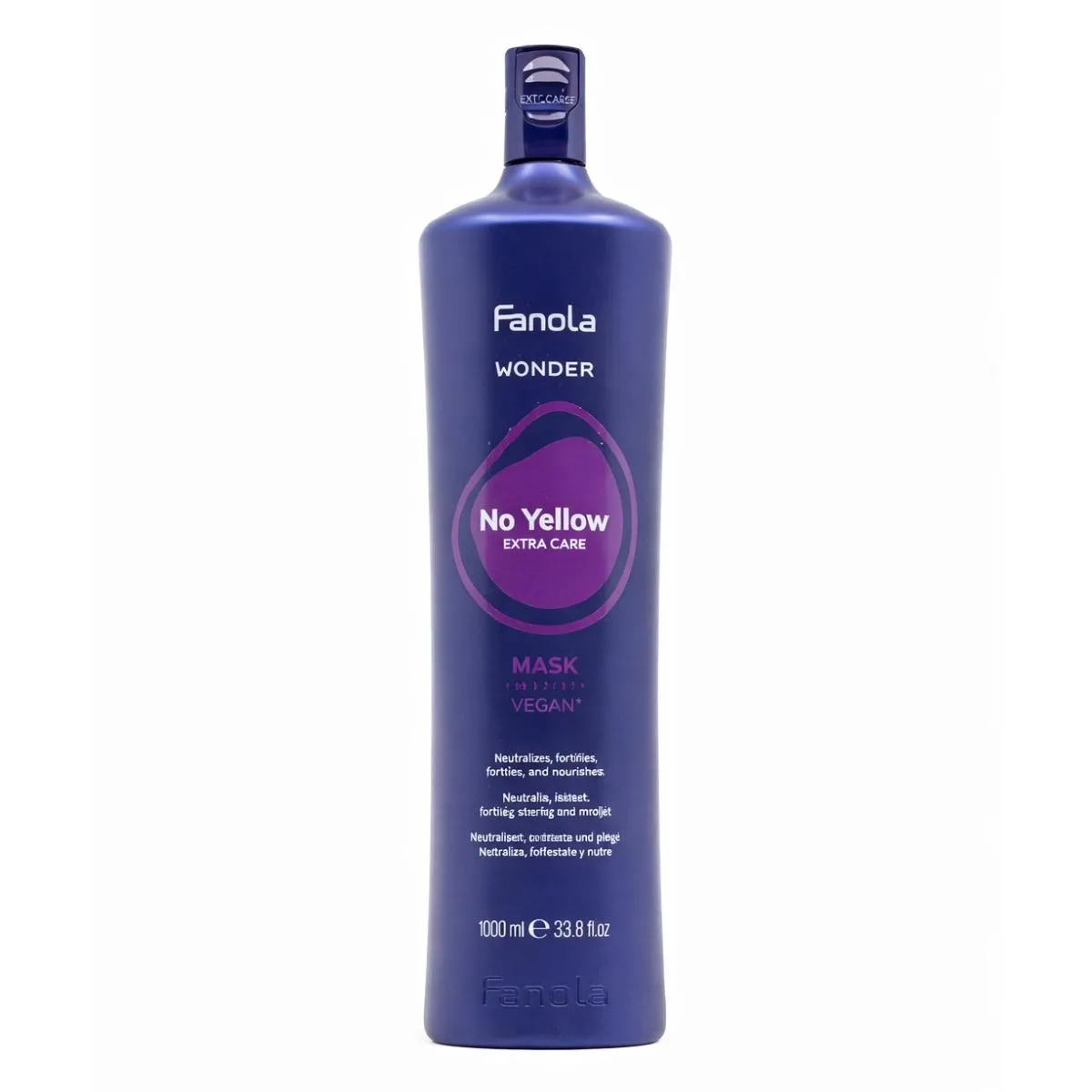 - Fanola Wonder No Yellow Extra Care Mask neutraliza los matices amarillos con pigmentos violetas diseñados para contrarrestar la dominancia de los tonos cálidos en fibras claras.