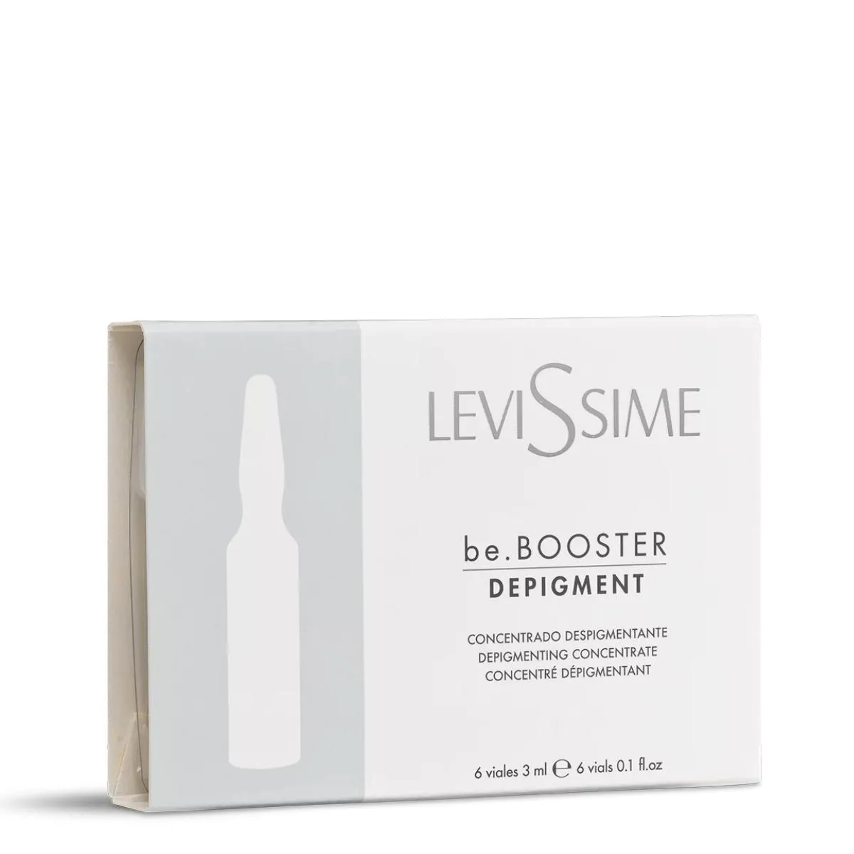 - LeviSsime Be.Booster Depigment 6x3ml viene en ampollas monodosis que facilitan la dosificación precisa y evitan la contaminación del producto.