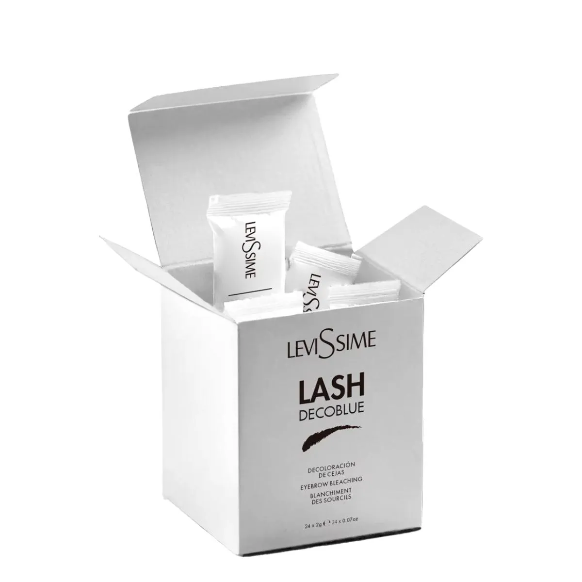 LeviSsime Lash Decoblue 24x2g es un polvo aclarador formulado para profesionales del servicio de pestañas y cejas que buscan un control preciso del tono durante los procesos de decoloración. Presentado en sobres individuales de 2 g (24 unidades por pack), combina una textura fina y homogénea con un pigmento azulado que ayuda a neutralizar subtonos cálidos, facilitando un aclarado más uniforme y predecible sin prometer resultados milagro. Diseñado para ser práctico en cabinas y fácil de dosificar, optimiza tiempo y reduce desperdicio.