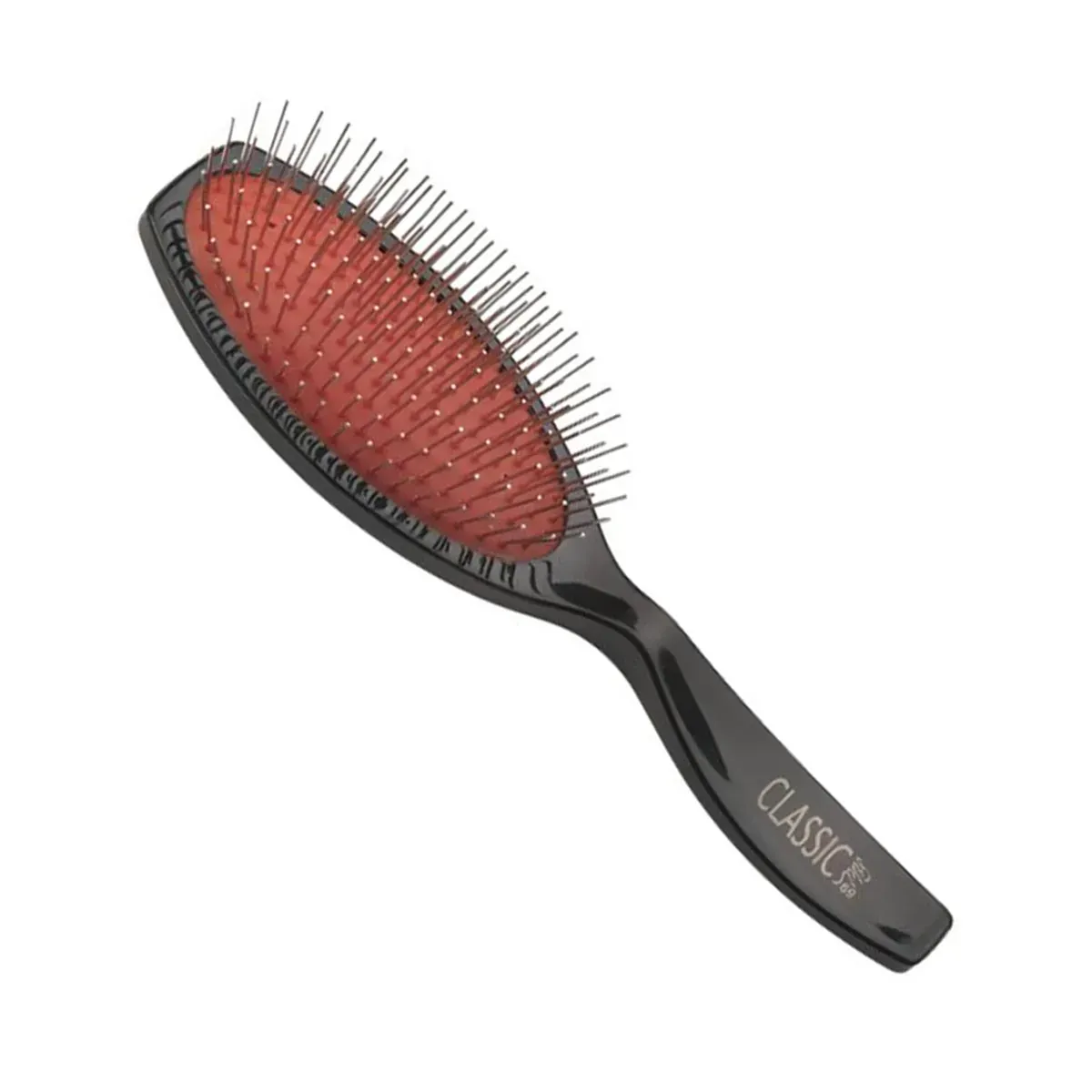 El diseño del cepillo prioriza la ergonomía: un mango antideslizante que se adapta a la mano, un cuerpo ligero para reducir la fatiga y una almohadilla neumática que aporta elasticidad en cada pasada. Esta base permite que las cerdas flexionen con la superficie del cuero cabelludo, proporcionando un deslizamiento suave que respeta la fibra capilar y mejora la sensación al cepillar. El acabado en negro le da un aspecto profesional y discreto que combina con cualquier espacio de trabajo.
