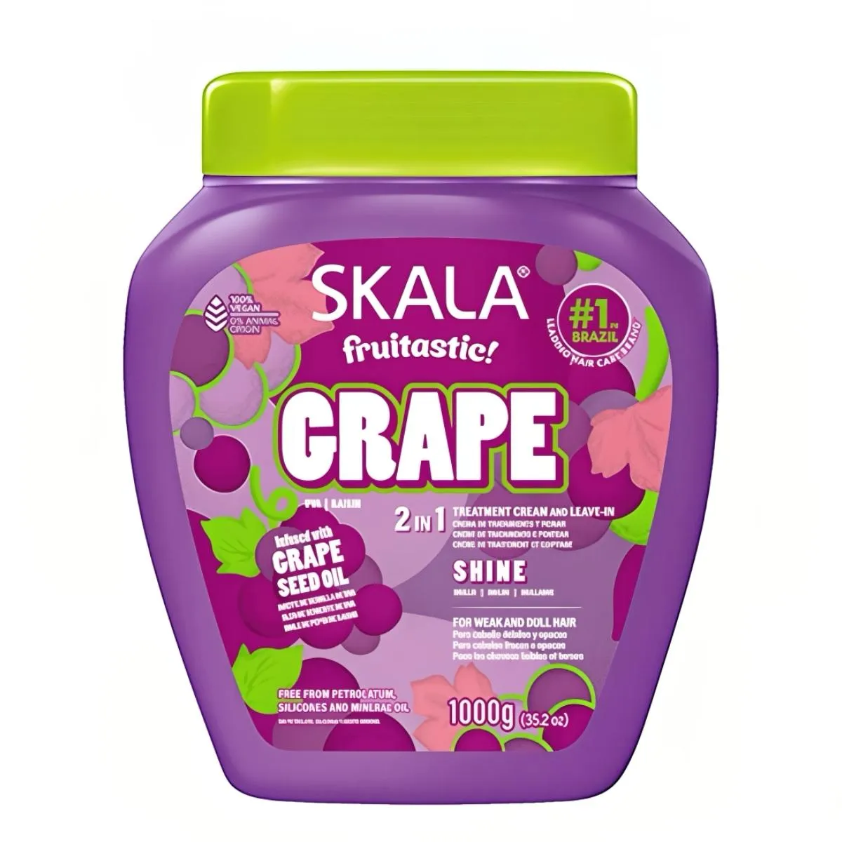 Hidratación intensa y brillo para todo tipo de cabello. Fórmula 2 en 1 con aroma a uva que desenreda, suaviza y facilita el peinado. Presentación familiar de 1000 ml.