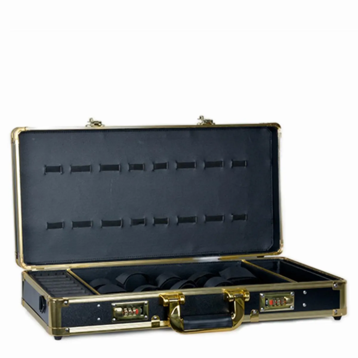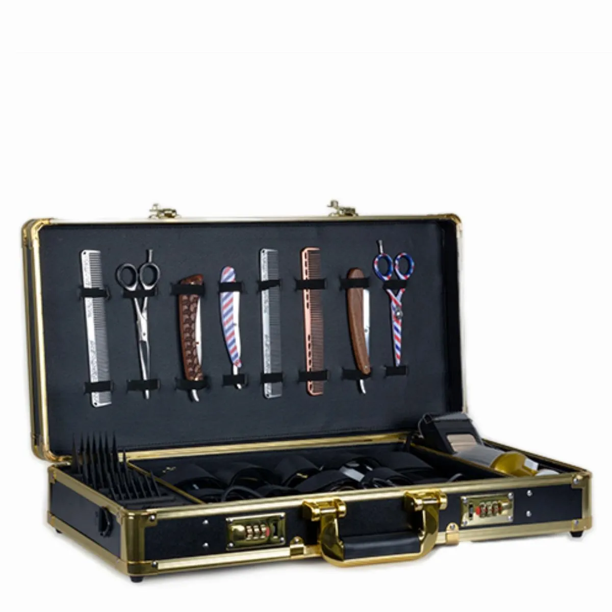 Maletín profesional resistente con acabado dorado, compartimentos organizadores y cierre seguro. Ideal para barberos que buscan estilo, orden y durabilidad en su equipo.